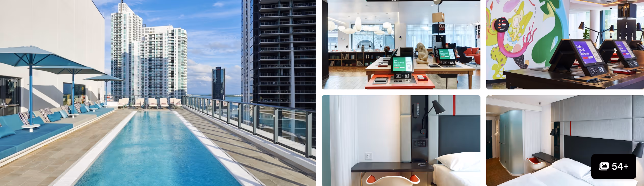 Has a rooftop pool and rooms with skyline and bayside views. The Financial District Metromover stop is nearby. The hotel charges a daily destination fee (around $40) and a one-time pet fee for dogs with a combined weight limit; check the latest policy and amounts when you book.